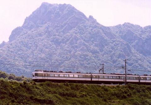 妙義山をバックに松井田の碓氷川鉄橋付近を走る189系あさま