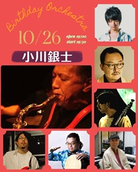 10/26(日)小川銀士Birthday Orchestra open19:00 start19:30 ¥5,500税込 sax小川銀士dr坂東慧 keyピッチャー水野 p宇関陽一 g鳴海賢治 b山本詠 per村上海人