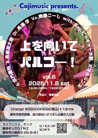 11/8(土)上を向いてパルコー! open18:30 start19:00 ¥3,080 vo齊藤こーじ g宗内義明 b長原英太郎 dr長澤学 with:keyピッチャー水野、天才ホーンズ