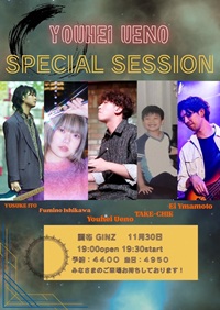 11/30(日)YOUHEI UENO SPECIAL SESSION open19:00 start19:30 ¥4,950 fl石川ふみの g伊藤ゆうすけgタケチエ b山本瑛 dr上野陽平