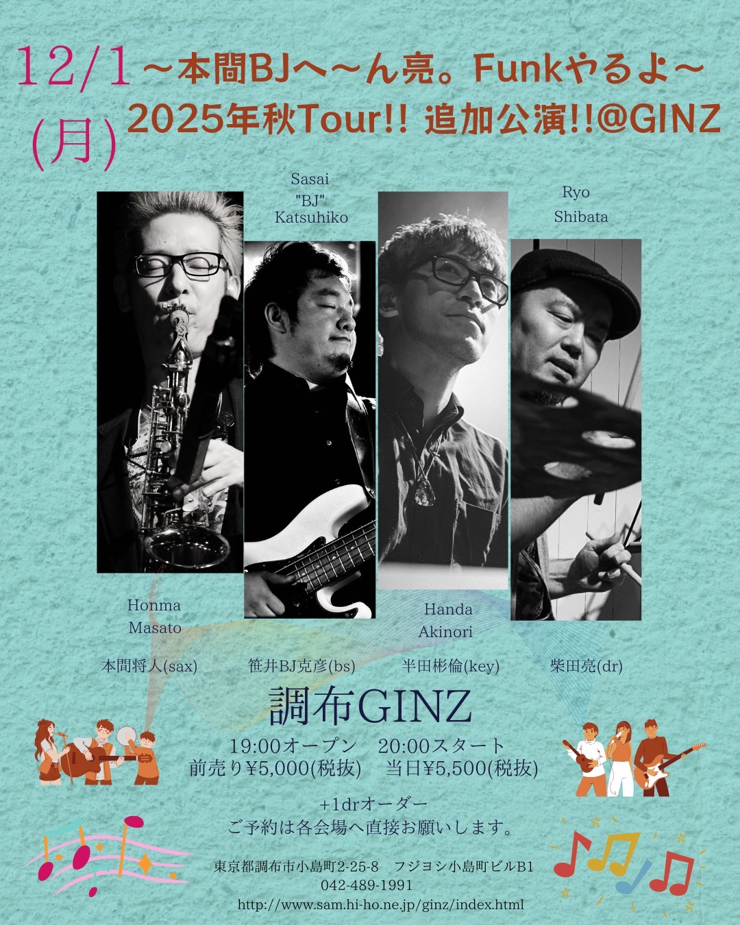 12/1(月)~本間BJへ~ん亮。Funkやるよ~ 2025年秋Tour!!追加公演!!@GINZ open19:00 start20:00 前売り¥5,000(税抜) 当日¥5,500(税抜) sax本間将人 b笹井BJ克彦 key半田彬倫 dr柴田亮
