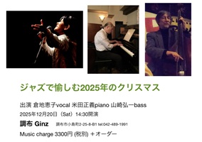 12/20(土)ジャズで愉しむ2025年のクリスマス open14:00 start14:30 ¥3,630税込 vo倉地恵子 p米田正義b山崎弘一