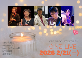 2/21(土)Ginz Live open18:00 start 18:30¥3,850 sax小川銀士voNORIKO keyピッチャー水野 b秋山瑞穂 dr油布郁