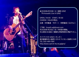 4/25(土)TN Acoustic Live in GINZ open19:00 start19:30 ¥4,400 中村隆道 サポートg,cho町野嘉信