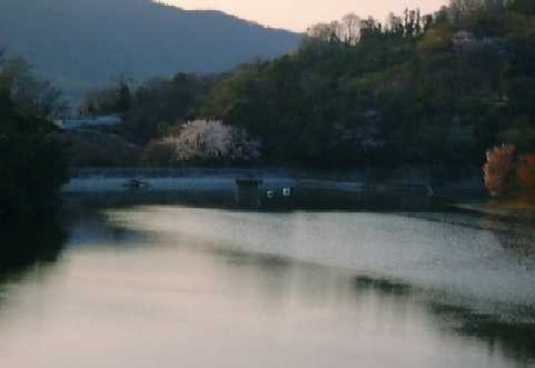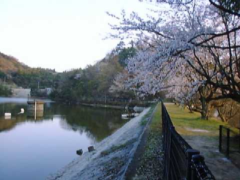 水源池は桜の名所の一つなんじゃ。堤防の桜並木は、数はそがいに多ぅなぁけど、水面に映った桜とあわせて、きれいなで。