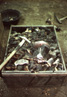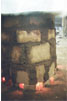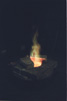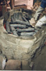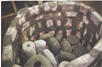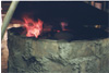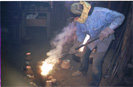 ここで説明させて頂く古式蝋型鋳造法は、蜜蜂の巣を加熱、圧搾して採取する蜜蝋と、松の樹から採取する松脂を調合した蝋を使います。両方を鍋などで加熱して混ぜ合わせ少し冷めたところで良く練り合わせてねかした物を、再びやや熱いめのお湯の中につけて温めると、粘りのある粘土のようになり、これを手でひねったり、予め土で花器などの形に作って置いたものに張り付けて、造形してゆきます。形が完成したら、前回使われた鋳型で、品物を取り出した後の型片を粉砕した物を、用途に分けて篩(ふるい)で分けた物に、山で採れる粘土を混ぜ合わせて土(真土=まね)を作り、蝋で作った造形物の表面を細かい順に、肌真土、中真土、荒真土というように覆ってゆきます。これで鋳型が出来ました。これから先は写真付きで説明させて頂きます。