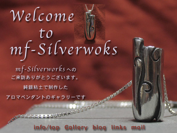 | info/top-------------- mf-Silverworks ~銀捻堂~プロフィール 日常は密教寺院(東寺、高野山、延暦寺が代表的)で使われる法具製作工房にて日々の糧を得る。以前ブロンズ作品で京展入選経歴あり。 日頃からの仕事を離れて、自分の思うままの形を純銀粘土で造形した作品を公開して行きます。 あまり作り込み過ぎないように、木肌や岩肌のようなイメージ持つ作風で、もっさりにならないように自然な質感の作品が作れたらと思います。 コンセプトはアクセサリというよりは身につけられるオブジェを目指しています Gallery---------------- 純銀粘土で制作したアロマペンダントを展示しています。 アロマペンダントは、香り・・特にアロマテラピー用のエッセンシャルオイルを身につけるためのアクセサリーです。小さく丸めたコットン等にエッセンシャルオイルを染ませてから、作品の筒状の内部に納めて使用します blog------------------- 個々の作品の制作メモや印象などblogにて公開していこうと思いますのでblogも覗いて頂けると嬉しいです links------------------- ゆくゆくは純銀粘土で作品作りをされている方々のHPと交流出来たらと思っています |