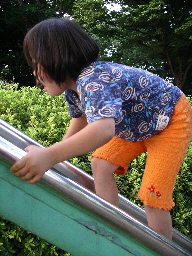 滑り降りるのも怖がっていたまどかが、滑り台を登り始めました。
