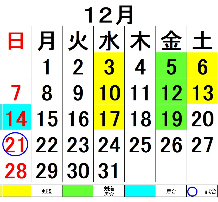 〇居合の稽古日は、12月5日(金)、12日(金)、14日(日)、19日(金)です。