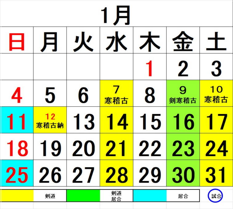 〇居合の稽古日は、1月9日(金)、11日(日)、16日(金)、23日(金)、25日(日)、