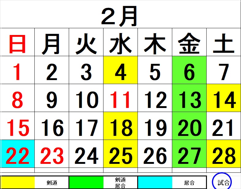〇居合の稽古日は、2月6日(金)、13日(金)、20日(金)、22日(日)、27日(金)です。