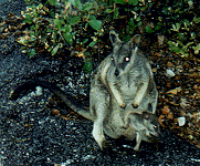 ロックワラビーを見るために、バスから降りる。そこで、ケーキとお茶を頂く。この日は雨が降っていたので、レインコートを借りた。岩間にこのロックワラビーはいるので、岩の上を降りていくのだが、何せ滑り易い。雨のせいもあるけど、かなり注意深く歩く必要がある。ロックワラビーは雨を嫌うので、なかなか餌に近づいてくれないけど、お腹から赤ちゃんロックワラビーが顔を覗かせながらやってきたときは、超かわいかった。