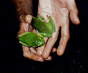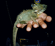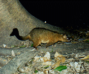夕食は、森の中のテントを張ったところでいただいた。他のバス3台のツアー客も集まって同じところで食事を取った。「夕食はカモノハシの肉とヘビの肉とカンガルーの肉」でした。これは、オージービーフとソーセージ(ヘビに形が似ている)とチキンの意味。ガイドさんが同じギャグを隣のテーブルでも言っているので、オチばればれの、シナリオ通りのセリフというところで笑える。夕食をいただいているうちに、辺りは真っ暗になり、テーブルの下にポッサムが現われてくる。客からのパンをもらい、木から落ちないように一生懸命食べている。テントの上をポッサムが走りまわったりとにぎやかだ。夕食を食べ終わった後は、森の中を懐中電灯をもって散策。レインフォレストドラゴンを見つける。