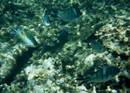 今回ツアーに参加したのは、30人ほど。1人を除いて全員日本人だった。日本語で説明してくれたスタッフはなんと韓国人の方。すごく日本語がうまい。英語担当のスタッフも韓国人だったけど、「ぼくは今日は必要ありませんね。」とこぼしていた。1時間ほどバスで移動して、港に着く。船が動き出すと、紅茶とクッキーを頂く。シュノーケルの道具の選び方やスキューバダイビング(別料金)の案内など説明がある。両岸がマングローブの木の川を進み、やがて海に出る。濁っていた水もだんだんきれいになってきた。島に近づくと、グラスボトムボートに乗り換え、ノーマンビー島に移動。テントを借りて、荷物を置いたら、早速シューノケリングの開始。確かに水の透明度は高い。ブダイ系の魚が多くいた。スタッフの方が、珊瑚の説明しながら魚の多いスポットに案内してくれます。泳げない人用に浮輪も用意されています。