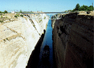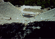 | ■コリンソス運河 今日はペロポネソス半島の旅。まずはコリントス運河を見学。全長6km、高さ(水面から橋まで)83m、幅28m。 | | ■エピタウロスの遺跡 ここで有名なのは、古代劇場。ガイドさんが音響効果を見せるため、舞台の中心から外へ手拍子を打ちながら歩いてくれた。舞台の中心の方が前方よりいい音が出た。1万4000人の収容力がある。今でも夏期の土、日にここで古代演劇が上演されている。 | |
