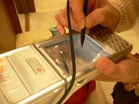 右の写真は、クレジットカードで買い物した時に機械にサインをしているところ。