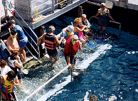 8:00にホテルピックアップでポート・ダグラスまで1時間半程バスに乗る。バスの中では、Quicksilverのツアーでこんなことができますといったビデオを上映してくた。いろんなホテルでピックアップをして行ったが、人数はそれほど増えなかったので人数が少ないのだろうと想像していたら、ポート・ダグラスに着いてびっくり、バスが数台とまっていて、人も多い。Quicksilverのカウンターで残金を払い、乗船券を受け取っ た。10:00に船は出港するが、9:30からセルフサービスのホットドリンクサービスがある。船が動き出すとドリンクサービスは終わっちゃうので、気をつけよう。