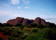 マウント・オルガとエアーズ・ロックはウルル・カタジュタ国立公園の中にある。カタ・ジュタとはたくさんの頭という意味でほんとぼこぼこしている。高さ546mでエアーズ・ロックより高いし、大きい。私たちは、ゲートを抜け、風の谷に向かって歩き出した。 夏の暑い日は危ないので、ゲートは開かないらしい。ガイドのA君は道筋に繁殖している草や木についていろいろ説明してくれた。本来ならここにこんなに木は生えていないけど、最近の異常気象で木が繁るようになったことなど・・・・。