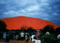 朝食をさっそく取り、エアーズ・ロックのサンライズのVIEW POINTに向かった。朝はちょっと冷える。やはりここも数十台の観光バスで大勢の観光客が集まっていた。朝日をバックにエアーズ・ロックを見るのかと思っていたが、朝日とは逆方向で、朝日に当るエアーズ・ロックを見るのである。徐々に日があたってきた。まるで、炭が燃えるような透明感があるような赤さだ。そして炭が黒ずむようまた暗くなっていくのだった。感動ものの色彩だった。この日は7:10から約5分間が見ごろだった。